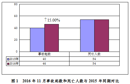 2016年11月,全國共發(fā)生房屋市政工程生產(chǎn)安全事故46起、死亡54人,比去年同期事故起數(shù)增加6起,同比上升15.00%,死亡人數(shù)持平(見圖1)。