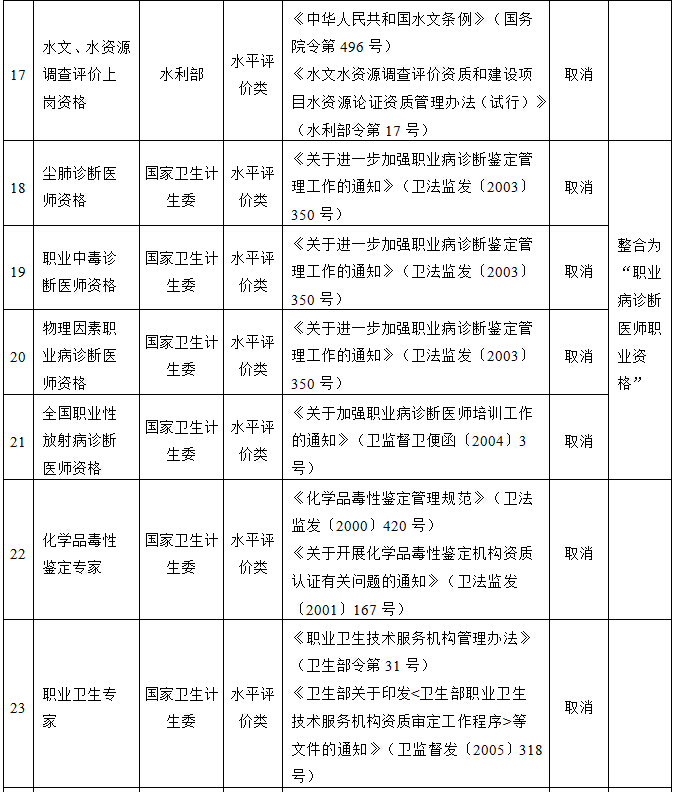經(jīng)研究論證,國(guó)務(wù)院決定取消61項(xiàng)職業(yè)資格許可和認(rèn)定事項(xiàng),現(xiàn)予公布。同時(shí),建議取消1項(xiàng)依據(jù)有關(guān)法律設(shè)立的職業(yè)資格許可和認(rèn)定事項(xiàng),國(guó)務(wù)院將依照法定程序提請(qǐng)全國(guó)人民代表大會(huì)常務(wù)委員會(huì)修訂相關(guān)法律規(guī)定。