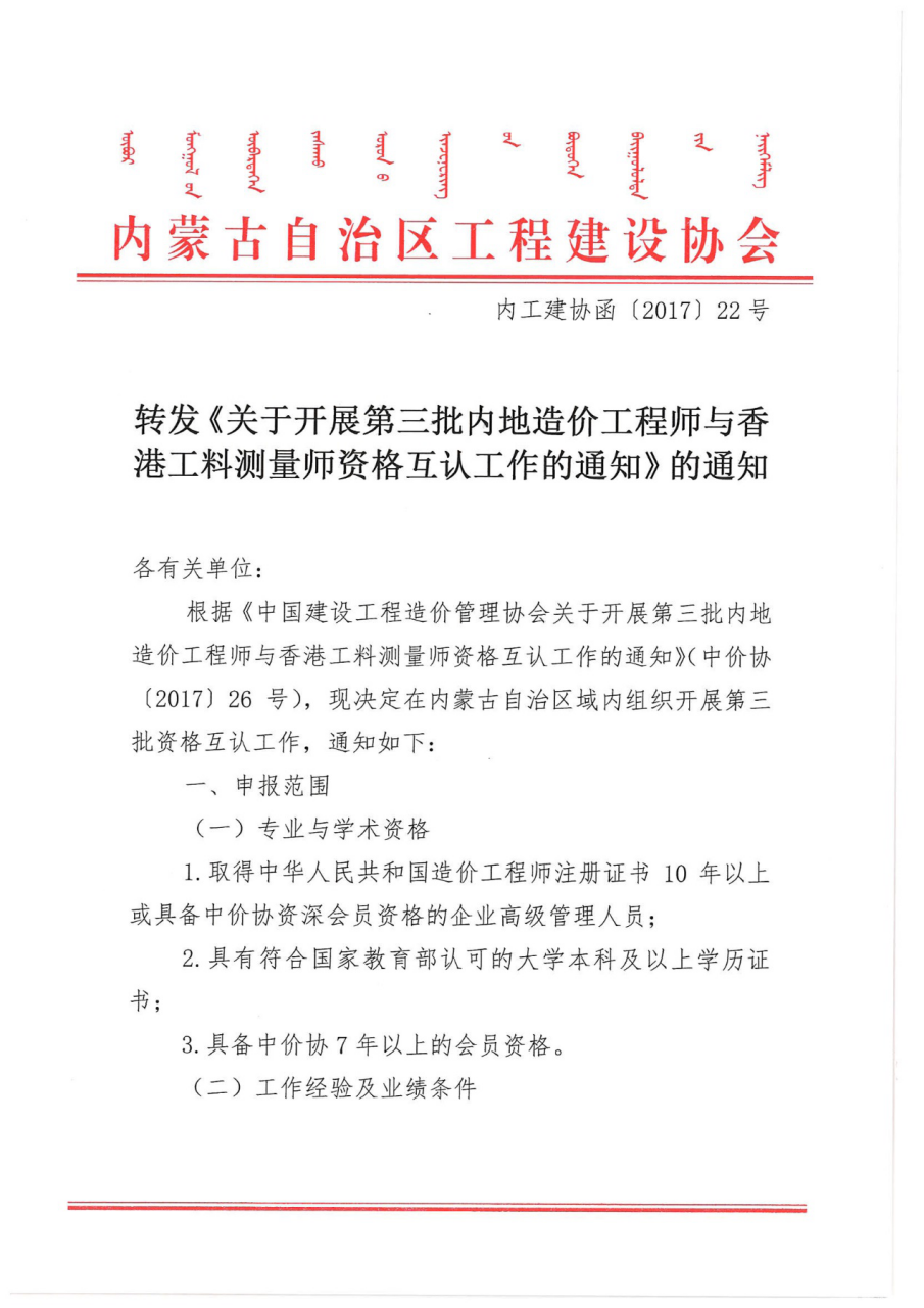 附件:1. 《關(guān)于開展第三批內(nèi)地造價工程師與香港工料測量師資格互認(rèn)工作的通知》(中價協(xié)〔2017〕26號).docx